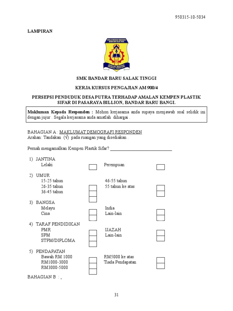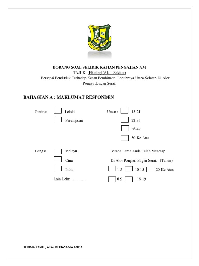 Doc Borang Soal Selidik Kerja Kursus Pengajian Am Kod Mata Pelajaran 900 4 Bahagian A Data Demografi Responden Chrys Annie Rayvious Academia Edu